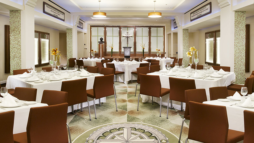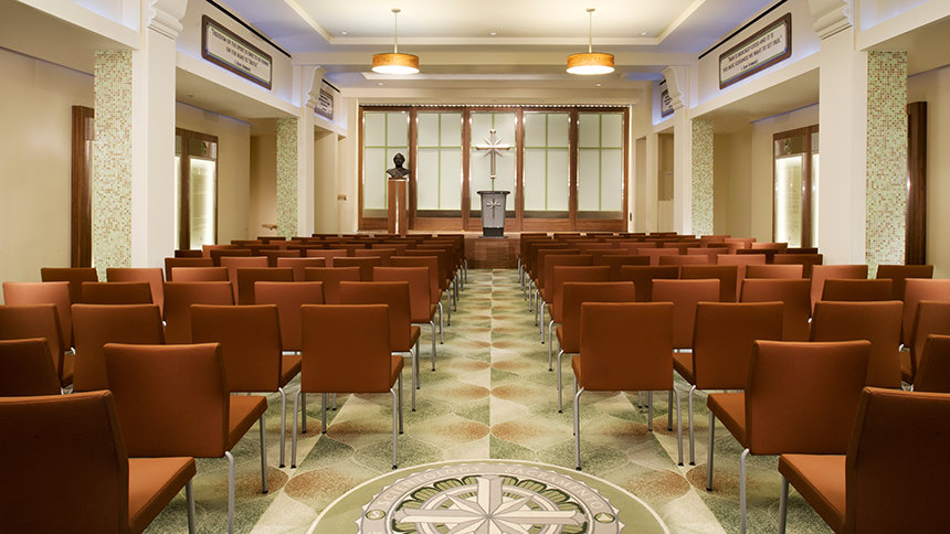 El nuevo hogar de la Iglesia, ubicado a unas cuadras del Capitolio Estatal, es uno de los edificios históricos más prominentes de la ciudad. Inaugurado originalmente en 1930 como el Hotel Ramona y diseñado por el primer arquitecto del estado de California, el edificio es el ejemplo existente más fino del estilo de Revival Español Colonial. La Iglesia meticulosamente preservó la estructura del edificio y restauró sus características a su gloria original, incluyendo el característico estuco, ladrillo glaseado ornamental, mosaico de terracota, acentos decorativos de hierro y el signo original en forma de espada. Toda la restauración fue planificada y ejecutada para tener el impacto ambiental mínimo y la máxima sustentabilidad, cumpliendo los estándares dorados de diseño del Consejo de Liderazgo de Edificio Verde (LEED).
