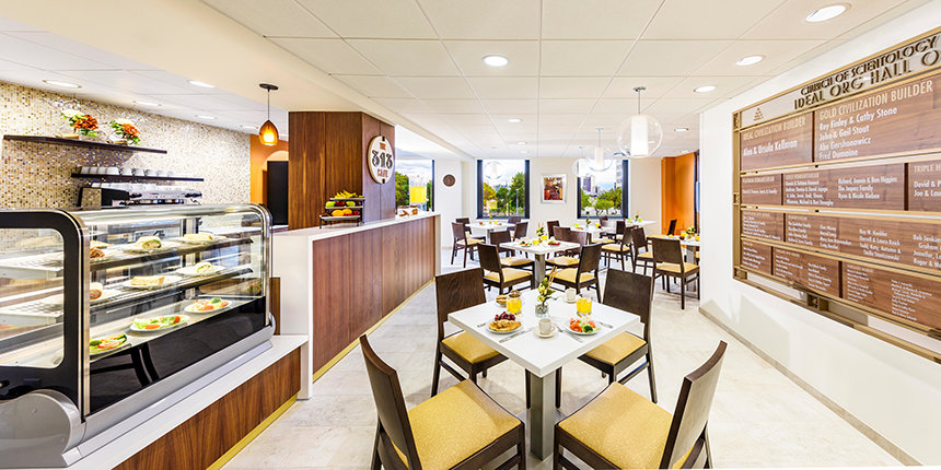 El Café ofrece un lugar de reunión para quienes asisten a los eventos, así como para los feligreses durante los descansos en sus servicios de Scientology.