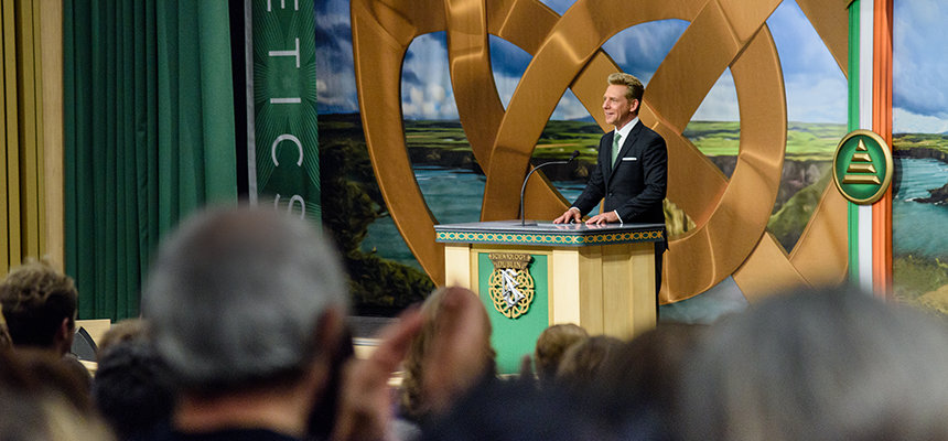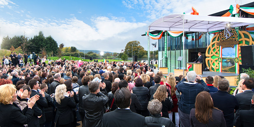“Hoy cumplimos con la promesa de honrar una tierra que nuestro Fundador, L. Ronald Hubbard, quiso tanto, y a un pueblo que él describió como maravillosamente amistoso, incluso cuando el clima algunas veces no lo es”, dijo el Sr. David Miscavige, líder eclesiástico de la religión de Scientology, a la multitud reunida. “Y si eso no lo explica todo, permítanme citar entonces de su propio Sr. Yeats: ‘El hombre vive y muere muchas veces entre sus dos eternidades…, y la vieja Irlanda lo sabía’”.