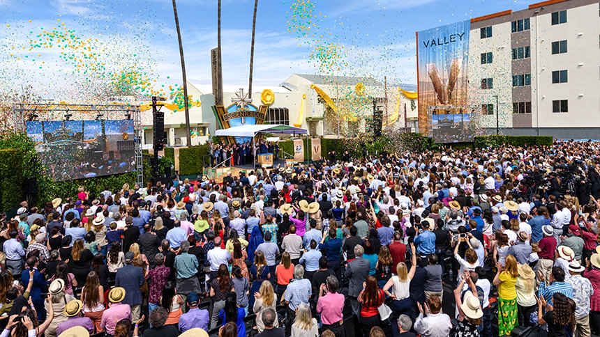 Así fue, el domingo, 19 de Marzo a la 1 p. m., 5 000 Scientologists se reunieron para ser testigos del nacimiento de Iglesia Ideal de Scientology más grande de Norteamérica. Fue una ceremonia acorde con el tamaño, alcance y el contenido del nuevo hogar de Valley, desde una mezcla de partituras clásicas evocando los días dorados del cine, al himno “V de Valley” escrito y preparado especialmente para la ocasión. Los miles de asistentes se pusieron de pie en una jubilosa celebración y aplaudió a cada dignatario apasionado elogiando el gran impacto social de la Iglesia.