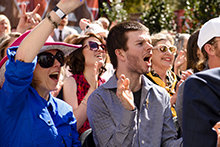 Una multitud eufórica aclama un corte del listón en la ciudad capital, celebrando la libertad de Texas en el área social principal de la ciudad, The Drag.