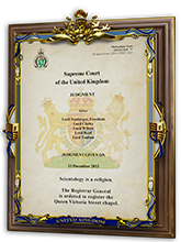 • En Inglaterra, donde, después de años de discriminación, el Tribunal Supremo del Reino Unido tomó una decisión unánime reconociendo la religiosidad de Scientology, redefiniendo lo que constituye una religión para el siglo XXI y más allá. Y donde ahora también se encuentra una Iglesia Ideal de Scientology en la Queen Victoria Street de Londres;