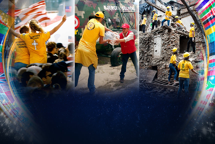 Después, el Sr. Miscavige destacó a los Ministros Voluntarios (VMs) de Scientology, ayudando y socorriendo individualmente en momentos de gran necesidad. En el último año, los VMs han ayudado y dado asistencia vitales de hemisferio a hemisferio: tras un huracán catastrófico en México, un terremoto en Japón, inundaciones en Kenia y en Brasil, ciclones en Bangladés, monzones en Nepal y tormentas en la República Checa.