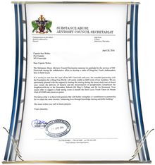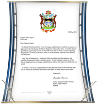 • La Comisión de la Policía Real de Antigua en reconocimiento de los casi 250 oficiales que ahora han sido educados en El Camino a la Felicidad obteniendo su promesa de aplicar esos preceptos para “inspirar [su] nación isla”.