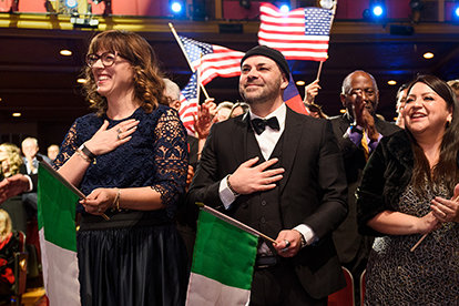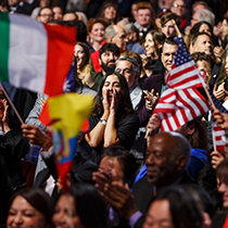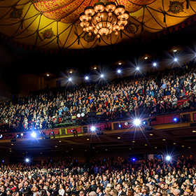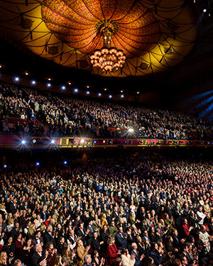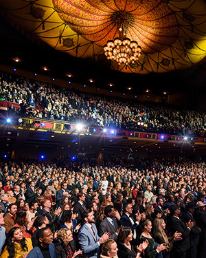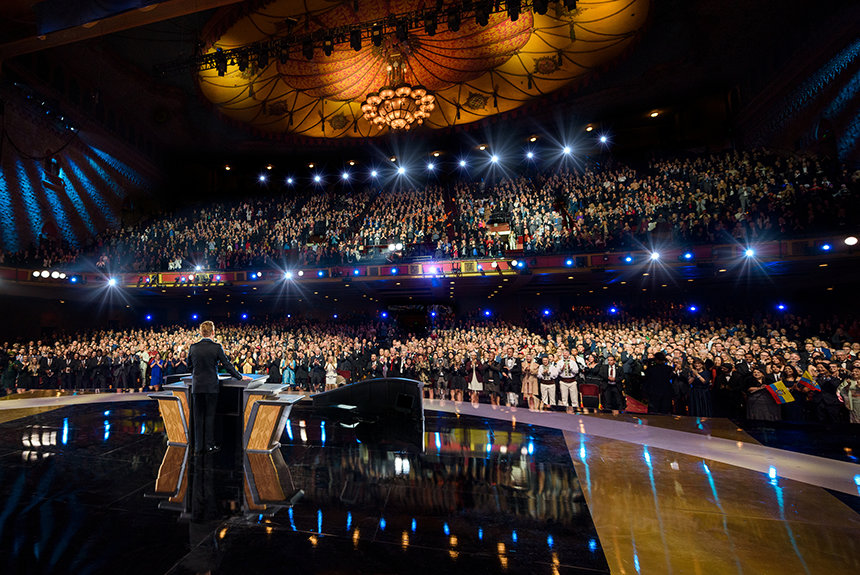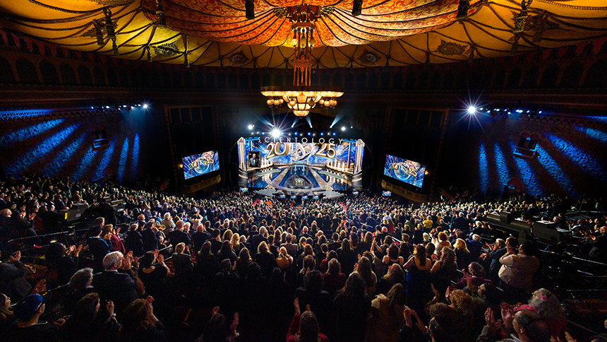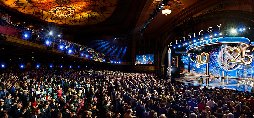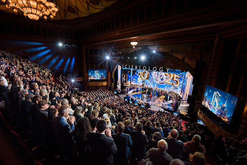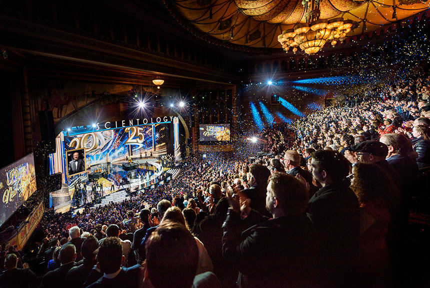 La grandeza del Auditorio Shrine de Los Ángeles proporciona el telón de fondo perfecto, ya que más de 6500 personas se reúnen para celebrar el Año Nuevo al estilo de Scientology.