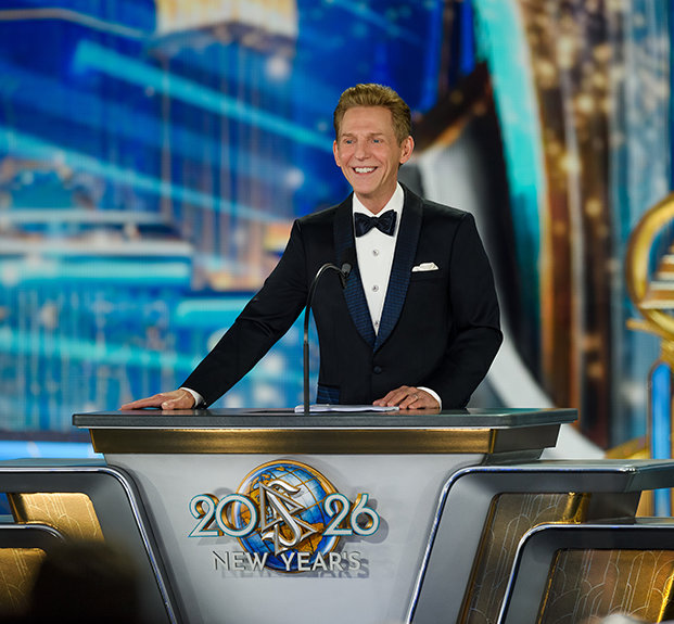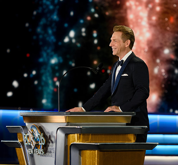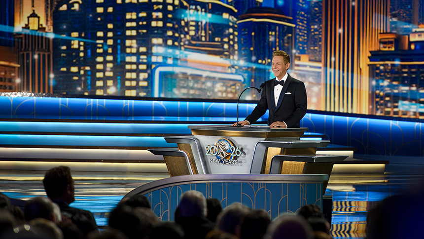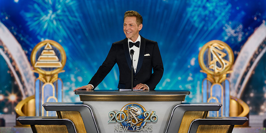 La velada alcanza su máxima intensidad cuando el Sr. David Miscavige, el líder eclesiástico de la religión de Scientology, aparece bajo las luces y la Celebración de Año Nuevo del 2026 cobra vida.