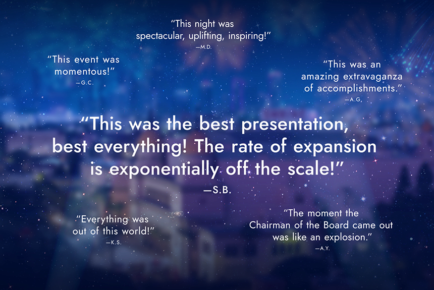 A medida que se acerca el amanecer de un nuevo año, la emocionante velada llega a una conclusión conmovedora con un gran final inspirador cuando el Sr. Miscavige pronuncia su mensaje de clausura.