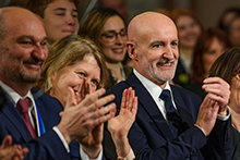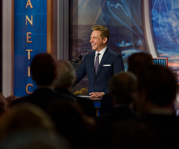 Pero las ovaciones más ruidosas, tanto en el interior como en los terrenos —donde miles más vieron el evento en pantallas gigantes colocadas en enormes pabellones con toldos para las multitudes desbordadas— fueron para el Sr. David Miscavige, Presidente de la Junta del Religious Technology Center, mientras dedicaba este nuevo centro espectacular.