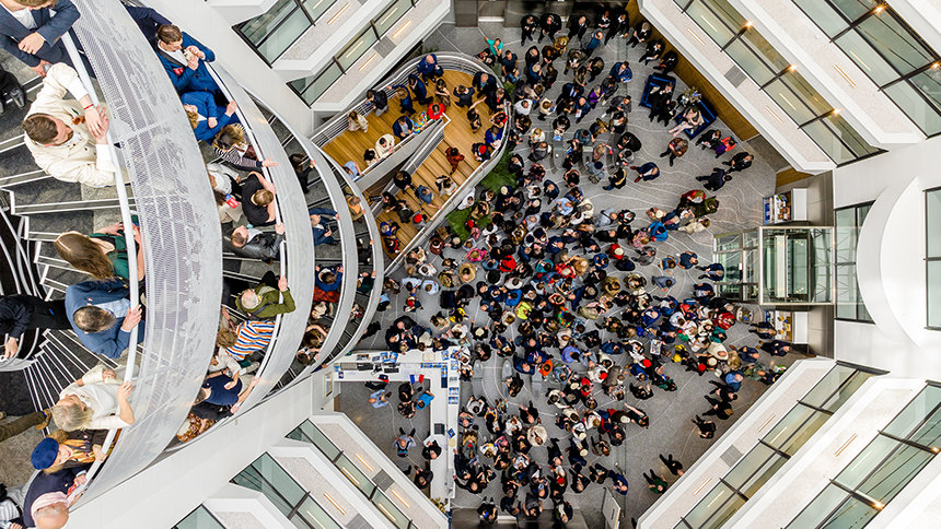 Más allá del resplandeciente exterior y del moderno portal de madera geométrica, el imponente atrio interior de la instalación refleja la presencia de un encantador árbol de secuoyas. Los “anillos de crecimiento” incrustados individualmente en el suelo de terrazos y una barandilla circular forrada con un patrón de hojas extienden el motivo de secuoyas mientras los invitados se abren paso en el espacio de 15 metros de altura bañados en luz natural desde el enorme tragaluz de arriba.